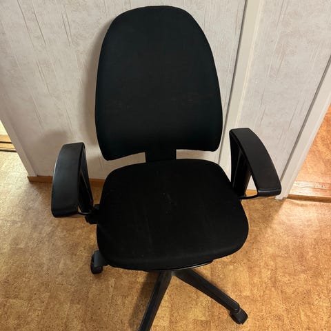 Hyvässä kunnossa oleva beige toimistotuoli.