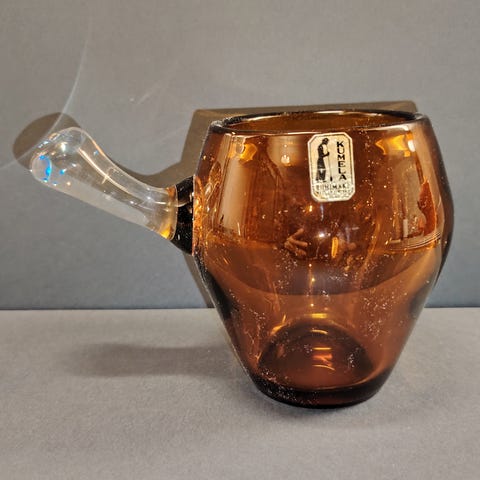 Lasinen kuppi, jossa syvän sininen runko ja kirkas, paksu kahva. Kuppi soveltuu esimerkiksi juomien tarjoiluun tai koristekäyttöön. Materiaalina on värillinen lasi, kahva on kirkasta lasia. Muoto on pyöristetty ja pohja kapenee hieman alaspäin, mikä antaa kupille tukevan olemuksen pöydällä.