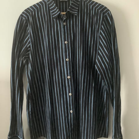 Hyväkuntoinen musta paita, jossa vaaleanpunaiset raidat. Hieman kulumaa kaulustaitteessa ja hihansuussa.