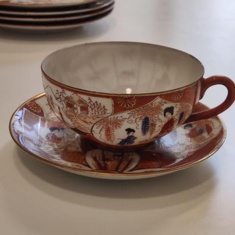 Hienoa posliinia olevat japanilaiset teekupit 1960-luvulta. Käsin maalatut. 8 kuppia ja 13 lautasta. Hyväkuntoiset, ei juuri käytön jälkiä. Hinta yhteensä kaikki kupit & lautaset.