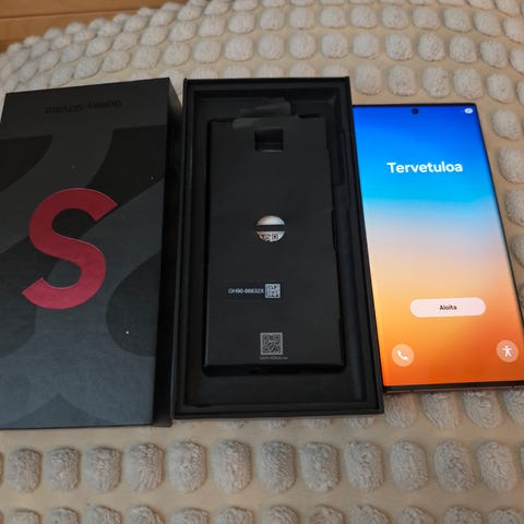 Samsung Galaxy S22 Ultra älypuhelin, tallennustila 128 GB. Väri musta. Kuvissa näkyy puhelin, laturi USB‑kaapelilla sekä suojakuori. Sopii yleiseen älypuhelinkäyttöön, kuten viestintään, internetin selaamiseen ja sovellusten käyttöön.Ei näkyviä käytönjälkiä puhelin on ollut seniori ikäisen käytössa. Eli puhelin on enimmäkseen viettänyt aikaa pöydällä.Laturi on 45W pikalaturi.