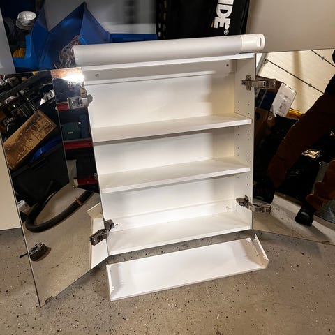 Valkoinen allaskaappi pesualtaalla ja hanalla