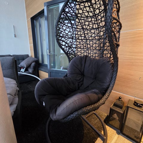 Riipputuoli käy parvekkeen tai terassin katolle ripustettavaksi myös pihapuuhun. Riippukeinu muokkautuu istujan mukaan, siinä saa myös jalat suoraksi. Mukana pehmuste. Puinen ripa, vahva kudottu verkko. Lev 100 cm, kork. 140 cm. Istuinpaino max 100 kg.
