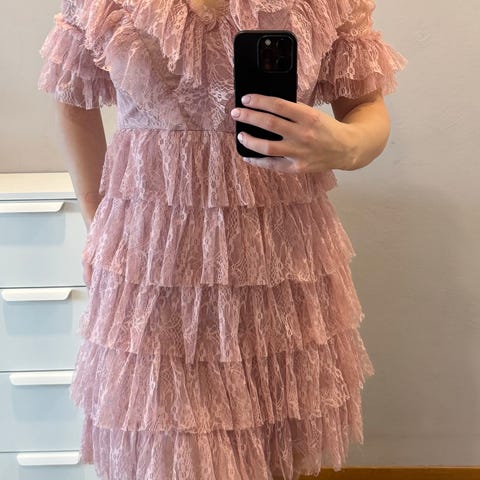 upea mekko, ostettu, muttei käytetty, eli uusi. kaunis yksi hiha, kauniisti laskeutuu. koko S