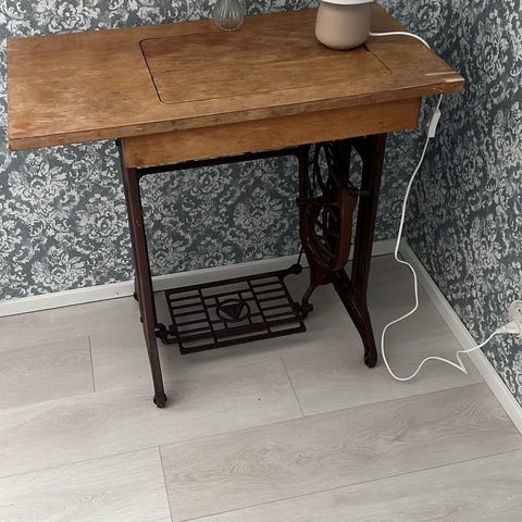 Puutyylinen ruskea ompelukonepöytä antiikkia. Pöydässä on suorakaiteen muotoinen kansi, jonka keskiosassa on aukko ompelukoneelle. Jalusta on puinen ja kaarevarakenteinen. Pöydän alla on tila esimerkiksi ompelukoneen polkimelle tai muulle laitteelle. Pöydän sivuissa on vetolaatikot pientarvikkeiden säilytykseen. Sopii ompelukoneen käyttöön tai pienenä työ- tai sivupöytänä.