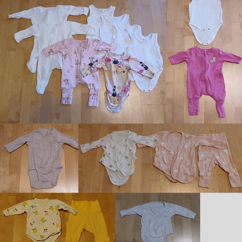 Myydään vauvan body 56-62 cm 9kpl,potkuhousut 62 cm 5 kpl.,vauvan lyhyt body 62 cm 8 kpl.vauvan body 62 cm 8kpl paita 2 kpl.housut 3 kpl,sukat 4 pari,pipot,pusero