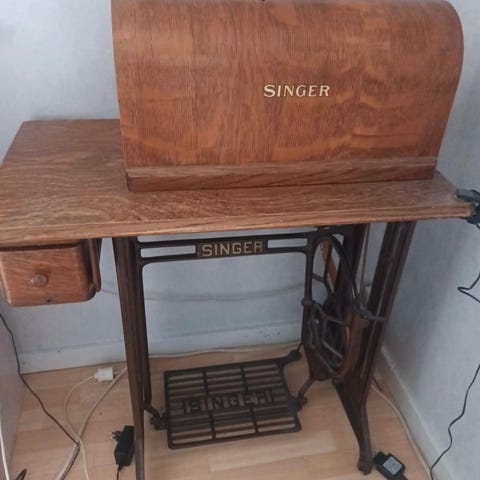 Poljettava ompelukonepöytä, jossa puinen kansi ja metallinen jalusta. Pöydän kannessa on luukku ompelukoneelle, ja alaosassa on poljinmekanismi. Sopii ompelukoneen käyttöön tai esimerkiksi pienenä sivu- tai työpöytänä. Materiaaleina puu ja metalli, väreinä luonnonpuu ja tumma metalli. Antiikkia