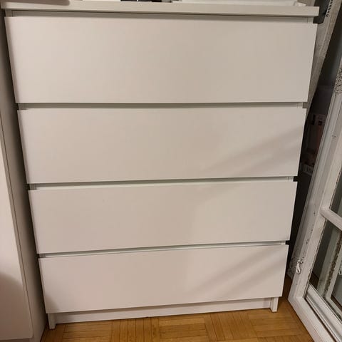 Myydään valkoinen korkea lipasto. Ostettu Jyskistä 2024, muuten hyvässä kunnossa mutta kulmasta vähän pinta irvistää, saanee liimattua (kuva).