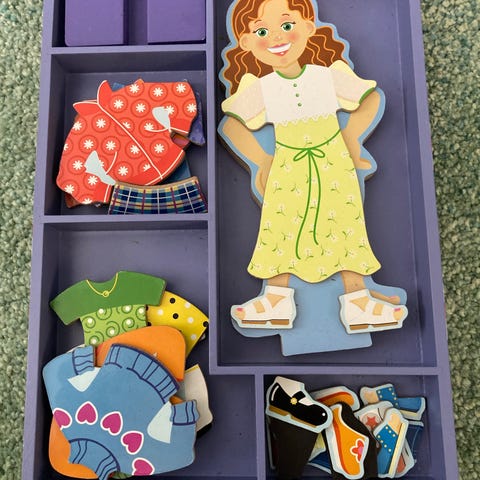 Melissa & Doug Maggie magneettinukke on puinen pukeutumislelu. Settiin kuuluu puinen Maggie-nukke jalustalla sekä useita magneettisia vaatteita ja kenkiä, joilla nukkea voi pukea eri asuihin. Osat ovat värikkäitä ja suunniteltu pienille lapsille käteen sopiviksi. Pakkaus toimii säilytyslaatikkona, jossa on omat lokerot nukelle ja vaatteille. Soveltuu rooli- ja pukeutumisleikkeihin sekä hienomotoriikan harjoitteluun.