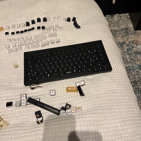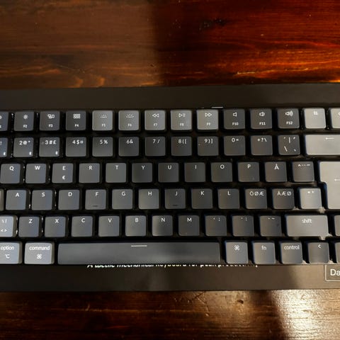 Keychronin 75% näppäimistö, ruskeilla kytkimillä. Takuu alkaen 9/25, ja paketista löytyy kaikki kilkkeet alkuperäistä USB-kaapelia lukuunottamatta.