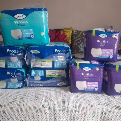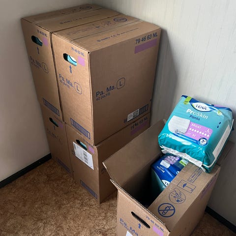 Yksi laatikkoa myynnissä. Yhdessä laatikossa 4 pakettia. Laatikon hinta 15€ ja yhden paketin 5€. Lähetys onnistuu mutta ostaja maksaa postikulut. Vaipan koko M.
