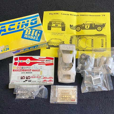 Racing43 / Big Model Lancia Delta Integrale HF rakennussarja Jolly Clubin (Totip) siirtokuvilla, Portugalin ralli 1993. Sarja sisältää valkometalliin valetun korin, pienosat, renkaat, kirkkaat osat sekä syövyteosien arkin.