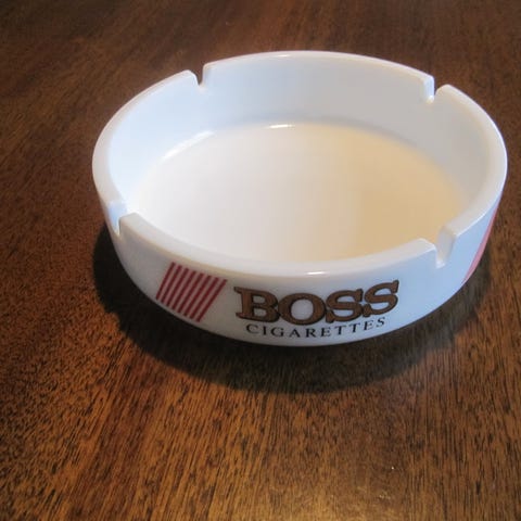 Hyväkuntoinen, kynäpurkkina toimistossa ollut The Boss-muki, musta, korkeus 9,5 cm. Ikä n. 20 v.