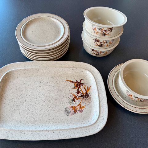 Myynnissä on metallinen tarjoiluvati ja pienet kulhot. Settiin kuuluu suorakaiteen muotoinen, koristekuvioitu tarjoiluvati kantokahvalla sekä pienet, pyöreät kulhot kansilla. Astiat ovat kullanvärisiä ja niissä on kohokuvioitu koristepinta.