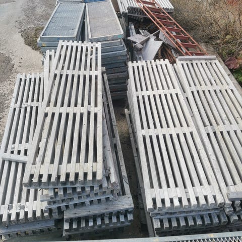 Ammattikäytössä olleen rakennustelinepaketin osia seuraavasti: