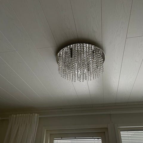 kattokruunu kristalliriipuksilla. Kattovalaisin koostuu metallisesta rungosta ja useista riippuvista kristallimaisista lasiprismoista useassa kerroksessa. Valaisimessa on kolme lampunkantoja rungon keskiosassa. En todellisuudessa tiedä minkä merkkinen tai kenen suunnitelema. Vanhaa kunnon tavaraa kuitenkin, toimii, ei mitään muovia tai halpaa niitetty peltiä.