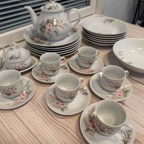 - 6 asettia/tassia, 5 matalaa lautasta, 4 kahvikuppia