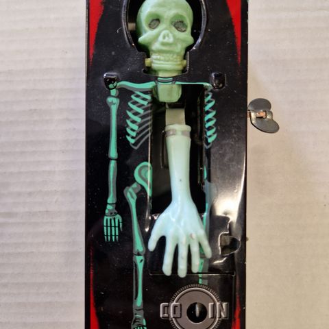 Koristeellinen luurankofiguuri johon kuuluu suihkulähde ominaisuus. Vesi tulee kallon silmistä ja siitä altaaseen ja takaisin pumpulle
