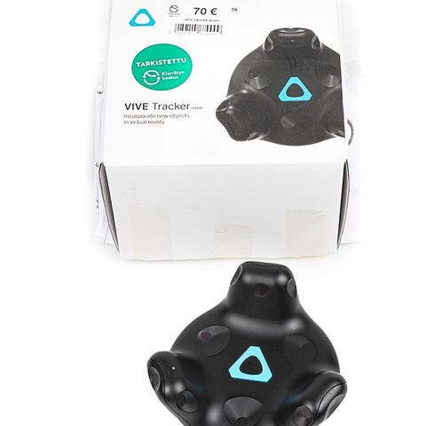 HTC Vive Facial Tracker kasvojenseurantalaite USB-C-kaapelilla. Yhdistyy koneeseen SRanipal-sovelluksella. Jos käytetään VRChatissä niin seuraa seuraavia ohjeita: https://docs.vrcft.io/docs/hardware/vr/vive/sranipal#set-up