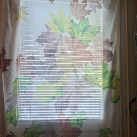 Perhosaiheiset valoverhot, leveys 120 cm ja korkeus 132 cm. Valoverhoissa yläosassa kuja myös tangolle.