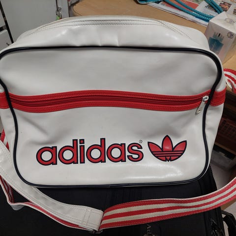 Adidas olkalaukku. Edessä yksi vetoketjutasku. Laukun sisällä useampi pikkutasku.