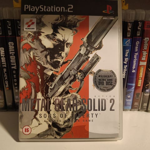 Konami Metal Gear Solid 2 Sons of Liberty Playstation 2 -peli. Fyysinen versio, joka sisältää pelilevyn ja kotelon kansipapereineen. Peli on tarkoitettu Playstation 2 -konsolille ja on luokiteltu ikärajalla 15. Genreltään peli on toimintaseikkailu, jossa pelataan yksinpelitilassa.