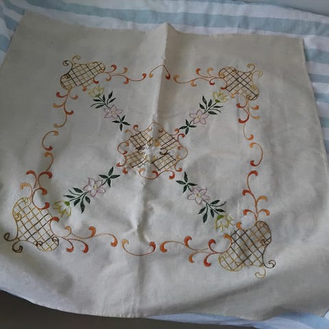 Puuvilla kangaalle kirjottu pitsireunainen pöytäliina