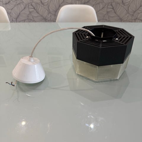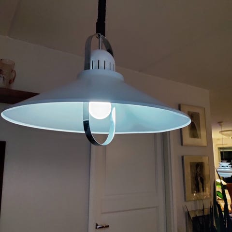 Christian Hvidt riippuvalaisin valkoinen metallinen. Valaisimessa on leveä, kartiomainen varjostin ja useampi sisäkkäinen heijastinosa, jotka suuntaavat valon alaspäin ja estävät häikäisyä. Materiaalina on maalattu metalli, värinä vaalea valkoinen. Valaisin soveltuu esimerkiksi ruokapöydän, olohuoneen tai keittiön yleisvaloksi.Dia.45cm