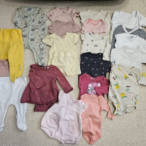 Hyväkuntoinen vauvan vaatepaketti kokoa 56 tai 50/56, myös muutamia kokoa 50. Monia eri merkkejä kuten Newbie, Muumi, Name it, H&M, Ciraf ym. Yhdessä bodyssa tahra jota en ole yrittänyt poistaa.
