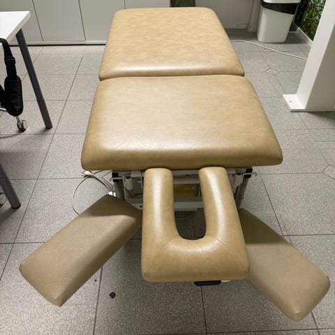 Quirumedin taitettava musta hierontapöytä. Pöydässä on musta pehmustettu keinonahkaverhoilu ja alumiiniset jalat puisilla yksityiskohdilla. Varustukseen kuuluu irrotettava ja säädettävä kasvotuki sekä käsituet.