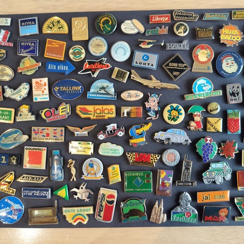 Sekalainen pinssikokoelma metallia ja emalia
