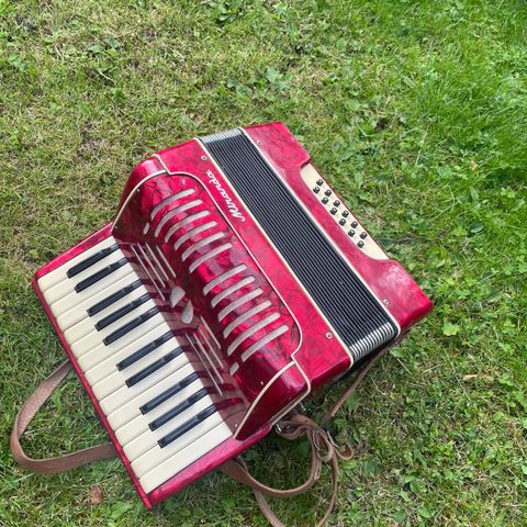 Akkordeon harmonikka punainen. Koskettimisto yläosassa ja bassonapit alaosassa. Sopii esimerkiksi perinteisen ja kansanmusiikin soittamiseen. Ulkopinta on punasävyinen helmiäiskuvioitu. Mukana olkahihna kannatteluun soittaessa.