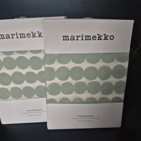 Marimekko Räsymatto pussilakana ja tyynyliina. Materiaali 100 % puuvillaa. Kuosina Marimekon Räsymatto, väritys mustavalkoinen. Pussilakana 150*210cm ja tyynyliina 50*60cm. Uusia, avaamattomat pakkaukset.
