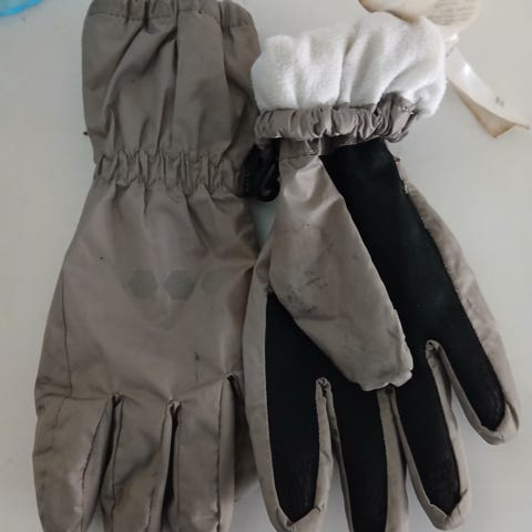 Kokoluokituksen mukaan noin 7-9 -vuotiaille sopivat heijastinhanskat. Kämmenosissa kulumaa, joka näkyy kuvissa.