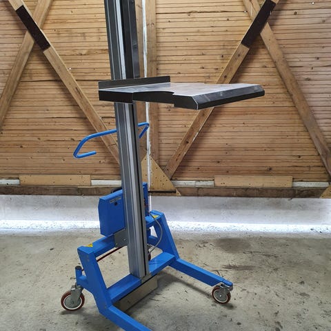 Kuvien mukainen nostopöytä siirtovaunu. Omalla akkukäyttöisellä 24v hydraulijärjestelmällä. Renkaat alla jolloin pöydän korkeus n.29 senttiä. Yläasennossa pöydän korkeus n. 90 senttiä. Pöydän koko n. 50*80 cm.
