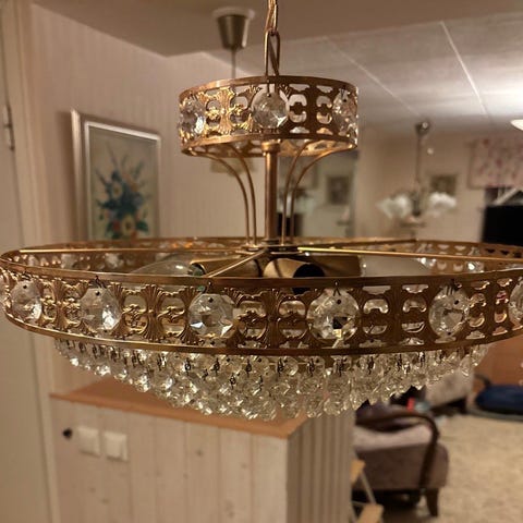 Hienokuntoinen kristallivalaisin. Halkaisija 58 cm. Ja lamppuja 10 kpl. Pistotulppa liitin. Kaikki kristallit tallessa. Tämä on upea. Nouto Tampereelta. Postitus sovittavissa erikseen.