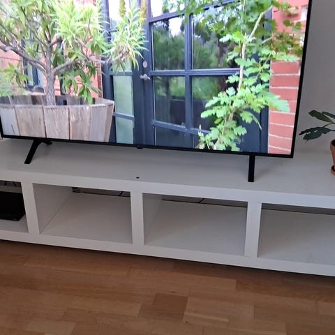 Valkoinen kiiltävä tv-taso. Kaksi jälkeä päällä (näkyy kuvissa). Vain nouto.