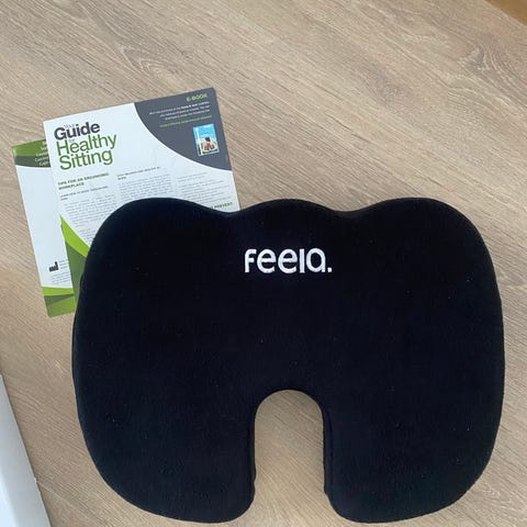 Ortopedinen istuintyyny musta. Tyynyssä on U-muotoinen etuosa ja paksu, muotoiltu istuinosa. Päällinen on mustaa, verkkomaista kangasta. Soveltuu käytettäväksi tuolilla tai penkillä istumisen tukena esimerkiksi kotona, toimistossa tai autossa.