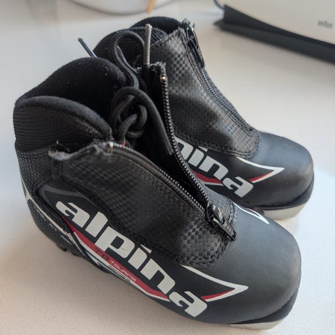 Järvinen lasten hiihtomonot. Väri musta, sisäosa vaaleansininen. Monot kiinnitetään tarranauhoilla.