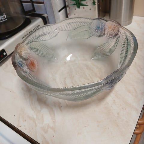 Myydään kuvan mukainen vanha kirkas lasikulho, vetoisuus 1 l. Kulhossa on koristeellinen, pyöreistä lenkeistä muodostuva reuna. Kork 7 cm, halk 17 cm, reunan kanssa 22 cm. Hyvä kunto, joitain pieniä ilmakuplia. Nouto Nastonharju tai sovitusti Riihelä. Käteinen tai mobilepay. Postitan kuluja vastaan.