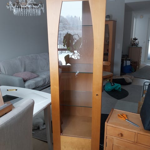 50 luvun vitriinikaappi, puuta. Kaapissa on liukuvat lasiovet yläosassa ja umpiovet alaosassa. Yläosan hylly korkeussäädettävä. Jalat Cabrioletyyliset kaarevat eläimen jalkaa muistuttavat