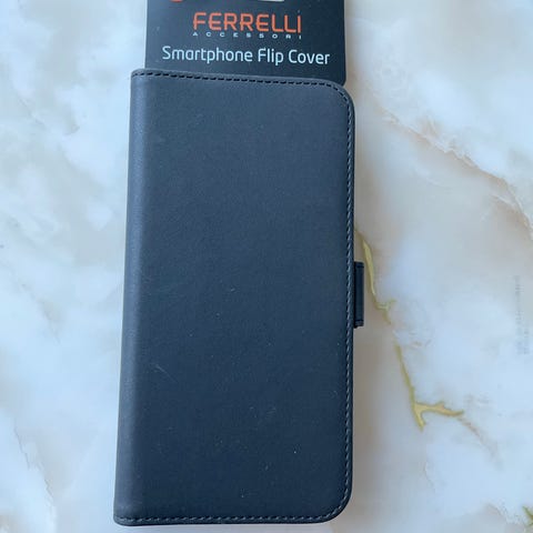 Apple puhelimen kuoret lompakkomalli musta. Kuori on kansimallinen ja siinä on rannelenkki. Sisäpuolella on korttipaikkoja ja läpinäkyvä tasku esimerkiksi henkilökortille. Puhelin kiinnittyy kovaan sisäkuoreen, jossa on aukko takakameralle. Ulkopinnassa on kohokuvioitu koristekuvio ja magneettikiinnitteinen läppä.