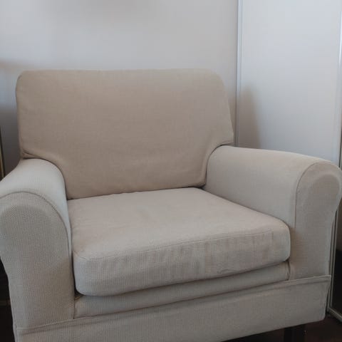 Tuolissa on havaittavissa kulumaa ja verhoilussa on pieniä tahroja, mutta se on muuten hyvässä kunnossa.