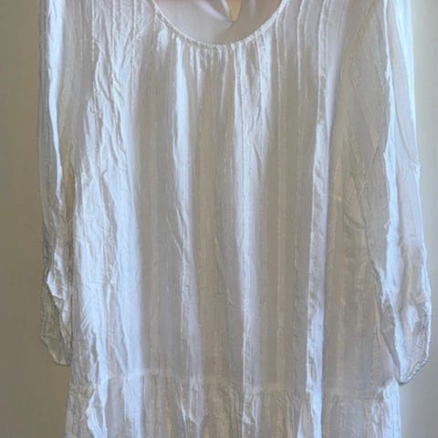 Musta/valkoinen kevyt pusero. Takaa pidempi kuin edestä. Takaa P 87cm, edestä 76cm, kai-kai 47cm. koko M