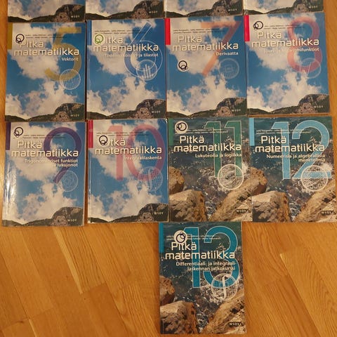 Hyväkuntoisia lukion pitkän matematiikan oppikirjoja, painokset vuosilta 2005-2013, Tammi ja Sanoma Pro. Postitetaan tai nouto sovitusti Helsingin Pasilasta