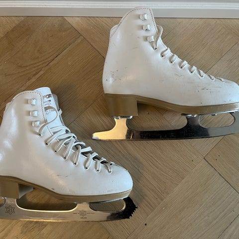 Lähes uudenveroiset, hyvin vähän käytetyt, erittäin hyväkuntoiset Risport Etoile aidot taitoluistimet erinomaisella hyväkuntoisella MK21 perusterällä. Koko 205 vastaa kengän kokoa 31, pohjallisen pituus 20,3 cm, leveys leveimmältä kohdalta 7 cm. Varsi erittäin tukevassa kunnossa. Terässä hyvin teroitusvaraa jäljellä, teroitettu vain ammattilaisella ja suht’ hyvässä terässä, eli suoraan jäälle.