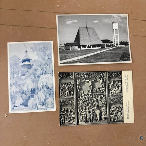 Tässä on komeita kuvia kirkoista Mikkelin läheisyydessä. Kortit maksavat 2 euroa kappaleelta. Postimaksu kirjeessä on 2,75 euroa 50 grammaan asti. Sitä painavampi kirje maksaa 5,50 euroa.