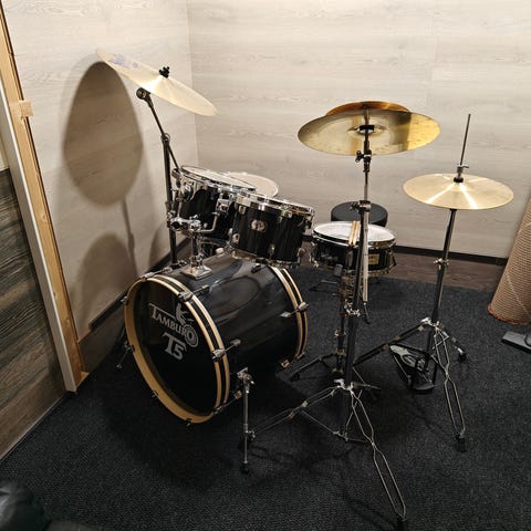 Hyvät vähällä käytöllä olleet rummut. Ammattilainen laittanut teipit rumpuhuin jotta ne eivät kaikuisi liikaa.