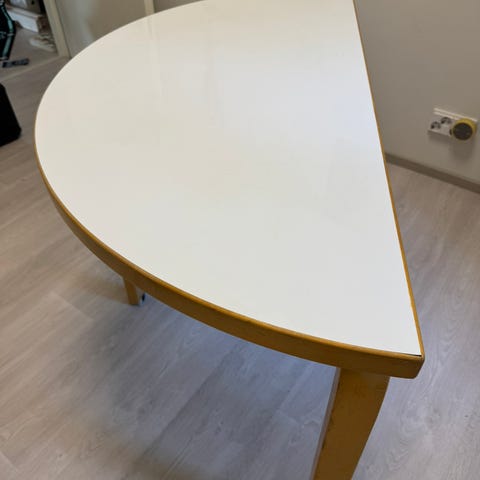 Artekin puolipyöreä lastenpöytä punainen linoleum. Pöytä on vanha talttapää ruuveilla ja siinä on kulumaa.