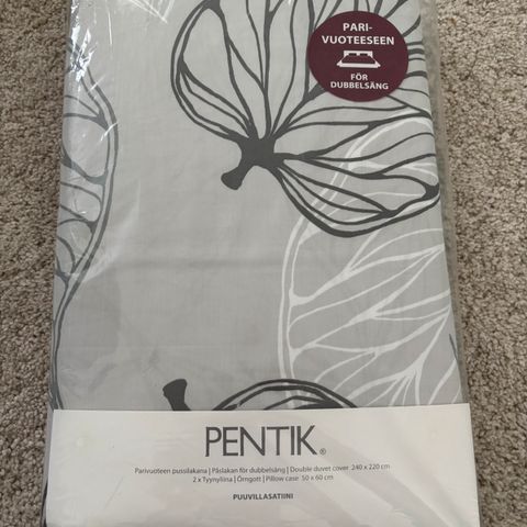 Myydään käyttämätön vaaleanharmaa Pentik-aluslakana parivuoteeseen. Koko 240 cm x 270 cm. 100% puuvillasatiini. Hinta 20€.